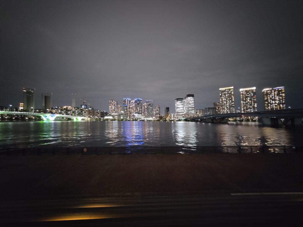 Notre hôtel est situé sur l’une d’entre elles, l’île de Toyosu depuis laquelle a été prise la photo ci-dessus. On aperçoit une partie sud est de Tokyo.